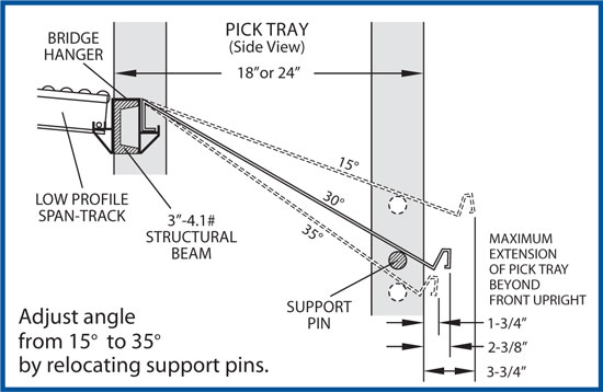 Adjustable pick tray's angle can be adjusted from 15° to 35° by relocating support pins. 18” or 24” deep pallet rack uprights or posts are required with an adjustable pick tray. Connect low profile track sections to adjustable pick tray with a bridge hanger. Standard sizes are 5' and 10' wide, 18″ and 24″ deep.