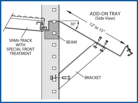Attach add-on pick trays to existing pallet rack without adding pallet rack uprights, posts or beams. Front/pick end of low profile span track drops into special front treatment and a bracket connects upright to tray for support. Standard sizes are 3' to 8' wide, 12″ and 15″ deep.