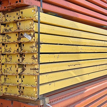 This 132 x 4 1/2 inch used teardrop old-style yellow beam is compatible with new, used, or reconditioned teardrop old-style pallet rack uprights.