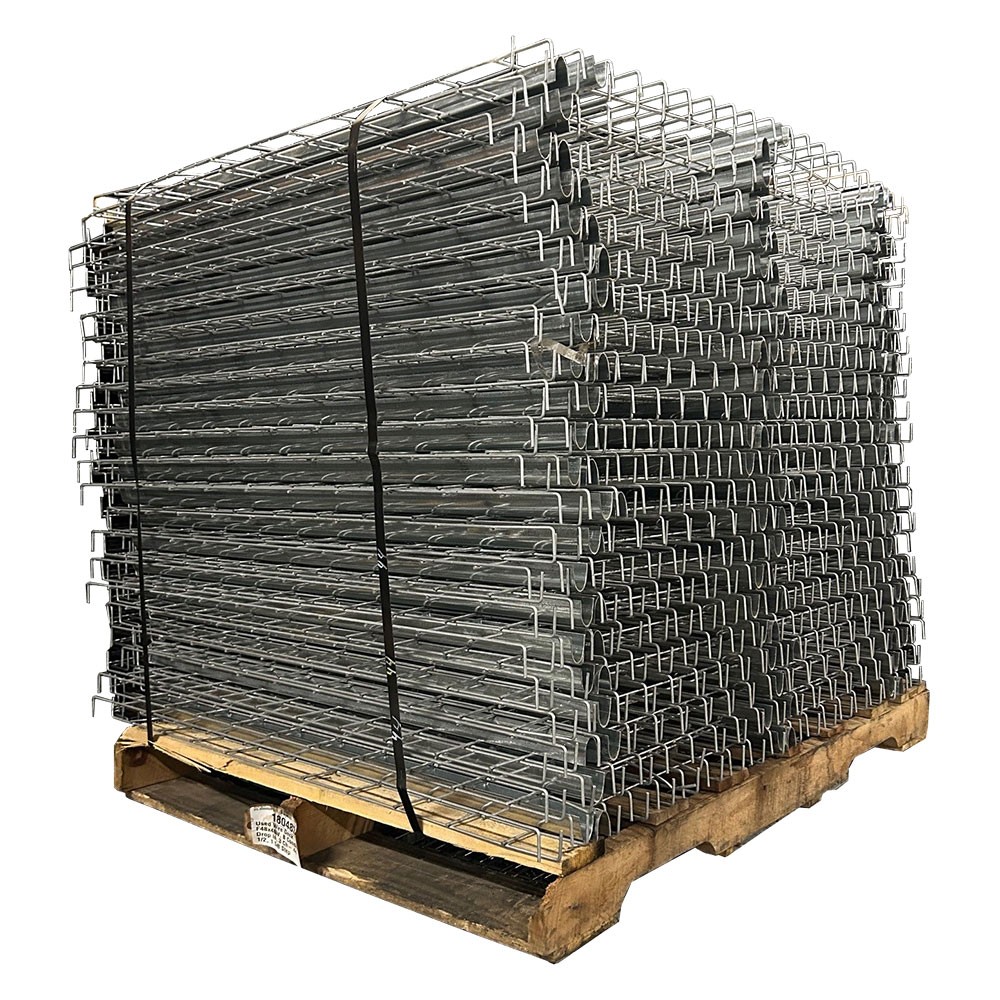 Pallet of forty 48 x 46 inch drop-in, standard full step used wire decks. Allows for the storage of smaller items and increased product visibility on a pallet rack storage level.